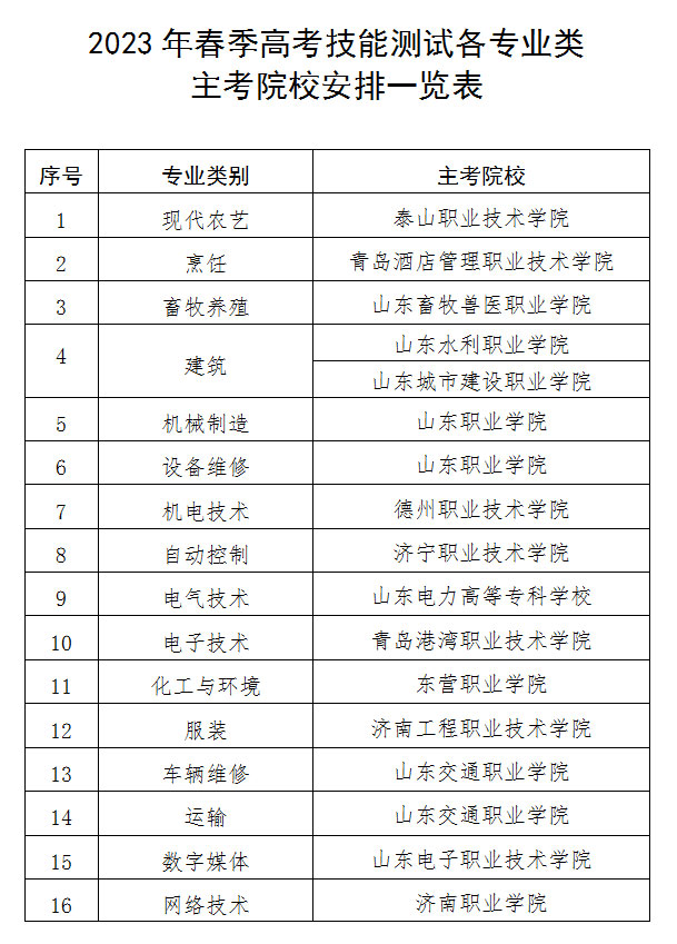 2023年春季高考技能测试各专业主考院校安排一览表,根据